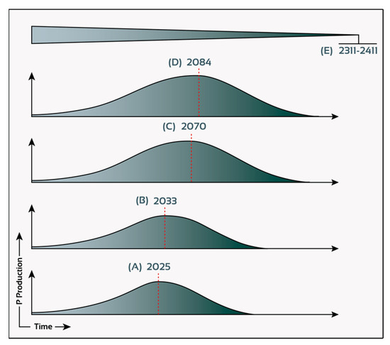 Future projections of phosphate rock production, with different estimates of the so-called phosphorus peak according to: A [113], B [114], C [11], D [115], and E [111].