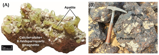 Photographs of the Moroccan apatite ores: (A) High Atlas Imilchil apatite gems [19]. (B) Dakhla Gleibat Lafhouda iron oxide–apatite ore associated with carbonatite complex [20].