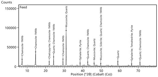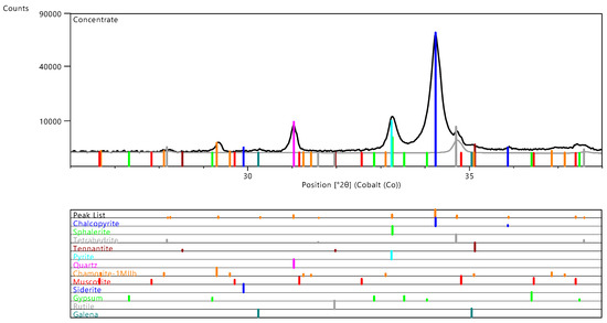 The major minerals with their distinctive most intense peak positions are reported in Figure 1. The material is an ore blend used as feed for flotation. Its diffraction pattern is the representative scan as defined by cluster analysis. The main diffraction peaks correspond to quartz, pyrite and phyllosilicates (chamosite and muscovite). The main copper-bearing mineral is chalcopyrite, which has several diffraction peaks in the range of 20–70 °2θ, the most intense at 34.2 °2θ, which is better observed in the diffractograms of a representative concentrate material (Figure 2). The diffraction patterns of tailings and feeds are quite similar, while the patterns of the concentrates display lower diffraction intensity of gangue minerals and higher intensity for copper, zinc and iron sulfide minerals. A list of major minerals can be found in Table 2.