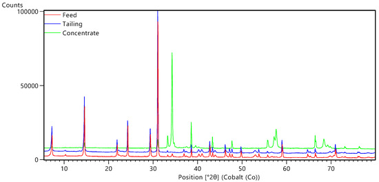 Characteristic XRD scans of the ore blend used as feed for the flotation cell, tailings and concentrates. XRD scans of tailings and concentrates are here vertically shifted by 3000 and 6000 counts for clarity.
