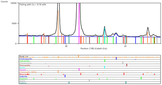 XRD pattern of a tailing sample with 0.16 wt% of copper in the range 26–38 °2θ. Upper curve represents measured data, lower curve in blue represents Rietveld contribution of 0.45 wt% chalcopyrite. Vertical bars are peak positions of crystalline phases.