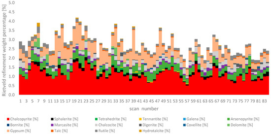 The phase identification was done with the HighScore Plus software package version 4.8 (Malvern Panalytical B.V., Almelo, The Netherland) [10] and the ICDD PDF-4 database (accessed on 3 March 2021) [11]. The phase identification was performed on specific, representative XRD scans selected by cluster analysis, which will be covered in the results section. The identified mineral phases are reported in Table 2, together with their averaged weight percentages as determined by the Rietveld refinement [12]. More than 10 other minerals were identified, but are mainly present in minor amounts, e.g., tennantite, galena, arsenopyrite, dolomite, gypsum, marcasite and chalcocite. The Rietveld routines were created with HighScore Plus and executed by software RoboRiet 4.8, a dedicated implementation of Rietveld quantification for automation projects. The results were verified by executing manual Rietveld refinements in HighScore Plus.