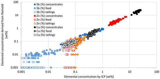 The accuracy of the XRD results was verified for all 265 materials by comparing the elemental composition calculated from the Rietveld refinements with the ICP values, see Figure 7. The elemental composition of copper, zinc and antimony can be fitted with straight lines which give, respectively, R2 values of 0.99, 0.98 and 0.96, and slope values of 0.99, 1.05 and 0.94. The automatic Rietveld analysis gave accurate results with precision that depends on the mineral species and their concentrations. For instance, the precision of zinc calculated from Rietveld greatly decreases when the zinc content is below 0.2 wt%, which corresponds to a sphalerite concentration of 0.3 wt%, Figure 7. The relatively higher LOD of sphalerite is due to its strong overlap with pyrite diffraction peaks.