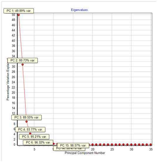 Eigenvalues plot explaining how the data variance is described by the most relevant principal components (PCs).