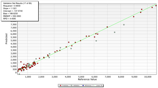 Essential information for the mining process can also be extracted from the raw XRD scans by training the SIMPLS algorithm (statistically inspired modification of the partial least squares) [14] implemented in HighScore Plus. The algorithm belongs to the data mining method of partial least square regression. In this example, the training values of antimony content in the concentrates were provided by ICP chemical analysis. Since PLSR is a statistical method, several scans are needed to obtain a reliable PLSR calibration file. Here, we used 72 XRD scans for building the model and 17 XRD scans, i.e., 20% of the scans, to cross-calibrate the model (Figure 10). The latter were used to calculate the Root Mean Square Error of Prediction RMSEP = 556 ppm, which represents 1σ standard deviation of the predicted values. The PLSR model can then be used to estimate the antimony concentration of unknown samples without the need of Rietveld refinement, especially for copper concentrates with antimony concentration between 287 ppm and 10,650 ppm, the concentration range of the training values.