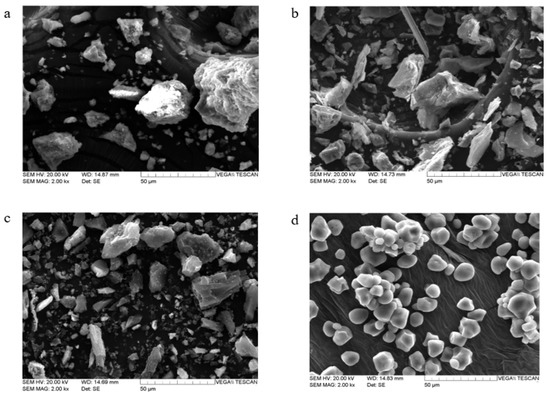 Scanning electron microscopy (SEM) images of (a) bentonite, (b) talc, (c) activated carbon, and (d) cornstarch.
