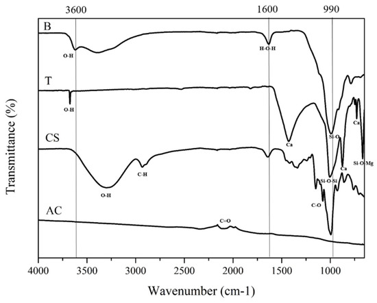 Fourier transform infrared spectroscopy (FT-IR) of various amendments applied to the soil (B: bentonite, T: talc, AC: activated carbon, CS: cornstarch).