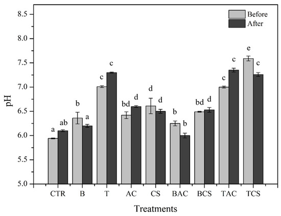 An increase in soil pH amended with AC and CS is mainly attributed to the existence of the carbonaceous materials and the surface oxygen-containing functional groups such as carboxyl and hydroxyl groups [48].