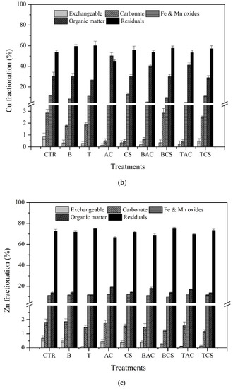 Based on the sequential extraction results, Zn was associated mostly with a residual fraction with an average value of 75 wt.% (Figure 4c). Amending soil did not change the share of the residual fraction of Zn. However, a slight increase in the organic matter fractionation of Zn was observed after adding to soil with AC and its composites (from 17 to 20 wt.%). A significant reduce in the easily leachable fractions (i.e., exchangeable and carbonate) of Zn was found after amending soil amendments. For Zn immobilization, T and its composites showed higher efficiency than other treatments. In detail, T, TAC, and TSC reduced the Zn mobility in the exchangeable phase by 89.7%, 86.7%, and 82.3%.