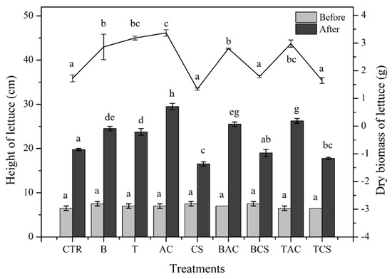 The study revealed that the response of plant to amendment application varied between amendment types (Figure 5). Amending soil, except for CS and its composites, significantly (p < 0.05) induced plant growth index after 45 d planting. Compared with the control samples (19.75 ± 0.25 cm), lettuce height significantly increased in B (24.5 cm ± 0.5 cm), T (23.75 cm ± 0.75 cm), AC (29.5 cm ± 0.7 cm), BAC (25.5 cm ± 0.5 cm), TAC amended soils (26.25 cm ± 0.55 cm). Adding soil amendments meaningfully increased the dry mass of lettuce from 1.73 ± 0.13 g in the control samples to 2.86 ± 0.46, 3.18 ± 0.07, 3.37 ± 0.12, 2.8 ± 0.02, 2.98 ± 0.13 g, in B, T, AC, BAC, and TAC, respectively. Previous studies showed that AC, T, and/or B can induce plant growth parameters mainly due to nutrient supply by these amendments [33]. Noteworthy, no significant change in the plant growth index was found using CS and its composites. This may be attributed to a decrease in soil respiration by the decomposition of CS which later reduces plant growth [57].