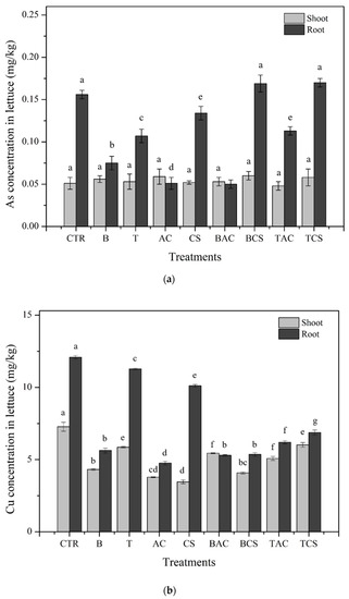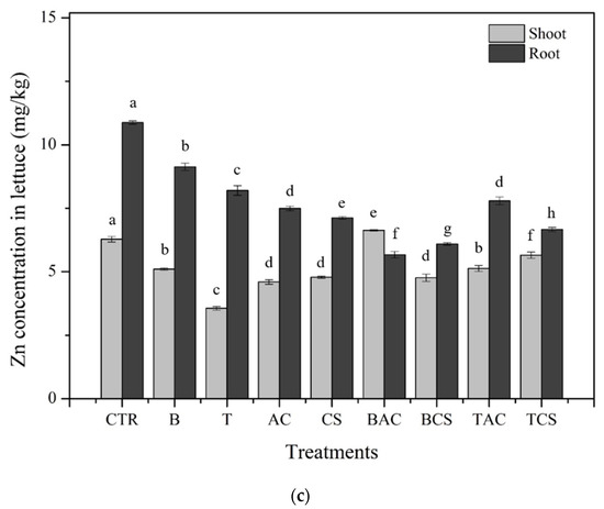 Figure 6 shows concentrations of heavy metal(loid)s in lettuce tissues after 45 days of planting. In Figure 6a, a small amount of As was observed in the plant shoots after amending soil with B (0.075 ± 0.008 mg/kg), AC (0.051 ± 0.007 mg/kg), BAC (0.05 ± 0.005 mg/kg), T (0.107 ± 0.008 mg/kg), and TAC (0.113 ± 0.005 mg/kg) compared with the control samples (0.156 ± 0.005 mg/kg), while the other treatments did not affect As accumulation in roots. Amending soil samples did not affect as uptake by plant shoots after 45 days of planting. Our study concurred with previous work that found an effect of AC and B on reducing the plant uptake of heavy metal contaminated in soil [16,34].