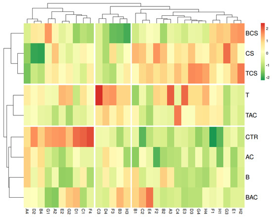 In Figure 9, the heatmap analysis with cluster dendrogram presents in more detail the effect of various amendment treatments on soil microbial community. It can be seen that the groups B, AC, and BAC were similar to the control response to carbon sources utilization compared to T, CS, and TCS. Furthermore, the groups of carbon sources utilized by microbes such as A3, C4, E3, D3, G4, H4, F1, H1, G3, E1, and H2 were the most affected when applying amendments. For the addition of B, AC, and CS, these carbon sources had no significant different change compared to the control; in contrast, T, CS, and TCS increased the carbon source utilization. Other carbon sources had fluctuating changes compared to the control soil when the amendments were added.