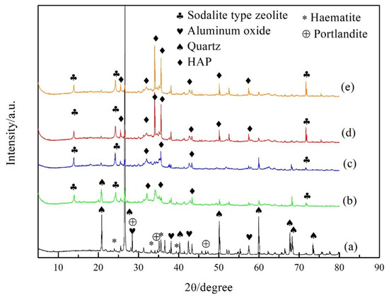 The XRD patterns of raw BFS and HAP-ZE samples obtained at various reaction temperatures are displayed in Figure 1. The XRD pattern of the raw BFS demonstrated that the BFS is mainly composed of the crystalline of SiO2 and Al2O3 (see Figure 1(a)). As Figure 1 presents, XRD profiles of the obtained HAP-ZE at different reaction temperatures from 80 °C to 120 °C display multiple diffraction peaks, and those are significantly different to the diffraction peaks list in the raw BFS. From Figure 1(b), the XRD patterns for 80 °C of reaction temperature revealed some diffraction peaks, which belong to HAP, sodalite type zeolite and aluminum oxide. Yet, the aluminum oxide existed, which means that the reaction process of zeolite formation was not complete. Comparing with HAP-ZE synthesized at 90 °C (see Figure 1(c)), the aluminum oxide phase disappeared, showing better developed crystals in HAP-ZE under higher reaction temperature. Meanwhile, as reaction temperature increased to 100 °C, except for the further increase of XRD intensity, the main phase has no obvious change (see Figure 1(d)). However, a further increase in the reaction temperature to 120 °C did not have a significant effect on the phase formation and phase intensity (see Figure 1(e)). That is to say, under 100 °C aging, both HAP and zeolites reached the maximum XRD intensity, indicating that 100 °C was sufficient to fully develop HAP-ZE samples.