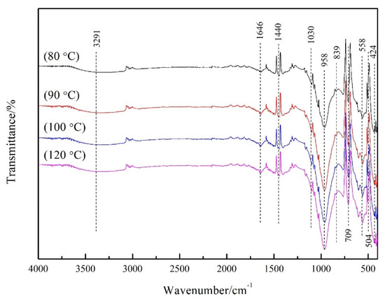 Figure 2 illustrates FT-IR spectroscopy of the HAP-ZE synthesized at different reaction temperatures which intends to study the details of HAP and zeolite crystallization development. Clear absorption peaks can be observed at 1030, 958, 839 and 558 cm−1 in the spectra of the synthesized specimens, those are normally due to the vibration of the PO43− groups [1,34]. Due to SiO44− and PO43− tetrahedral units sharing great resemblance, zeolite and HAP share plenty of similar vibration modes, such as 424 cm−1 (Si-O-Si stretch/P-O bending) and 1030 cm−1 (Si-OH deformation vibration/vibration mode of PO43− group) [1,34]. The peaks at 1440 cm−1 are owing to the CO32− exchanging the PO43− in the HAP. The peaks of the CO32− are a common product in every HAP obtained in the air [35]. The bands at 839 and 558 cm−1 are distinctly indicative of hydroxyapatite, which can serve as a solid proof for hydroxyapatite formation [1]. Meanwhile, the peak at 558 cm−1 was also attributed to the double ring that is a characteristic peak for zeolite [26,36]. Moreover, the peak at 504 cm−1 and 709 cm−1 were due to the internal linkage vibrations and asymmetric stretching of the TO4 tetrahedra in zeolite, respectively. Therefore, the FT-IR analysis again clarified the fact that the zeolite crystal was successfully prepared in HAP-ZE materials. In addition, the bands at 3291 cm−1 (stretching mode) and 1640 cm−1 (bending mode) are due to the existence of water molecules in HAP-ZE structure [37].