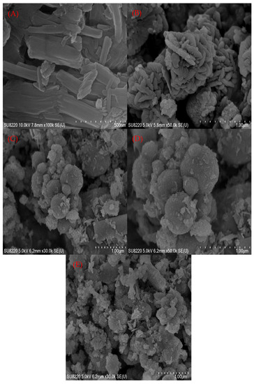 SEM images of (A) BFS; the product samples obtained at reaction temperature of (B) 80 °C; (C) 90 °C; (D) 100 °C and (E) 120 °C.