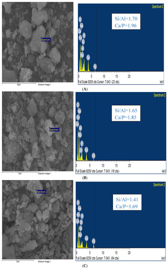 Table 3 presents alteration of chemical components and Ca/P, Si/Al and Na/Al molar ratio with reaction temperature. As shown in Table 3, a small amount of impurity metals was commonly measured in the HAP-ZE product, such as Mg and Fe. However, no Fe and Mg compounds were detected in the XRD patterns (see Figure 1); hypothetically, those impurity metals’ ions are distributed evenly into the structure of HAP-ZE by replacement of Ca2+ and Na+ sites in HAP and zeolite, respectively [29,30,31]. The Ca/P ratios were measured to be 1.85, 1.79, 1.61 and 1.72 at reaction temperature of 80 °C, 90 °C, 100 °C and 120 °C, respectively. The Ca/P ratios of HAP-ZE samples generally indicate that higher temperature is favorable for phosphorus to incorporate into HAP-ZE in the reaction system. The Ca/P molar ratio approached a value near 1.67 (stoichiometric composition of pure HAP) under the reaction temperature of 100 °C. However, at 120 °C, Ca/P ratios was 1.72, indicating that more Ca ions or Fe and Mg ions are involved in the synthesis of HAP than those of lower reaction temperature. Meanwhile, by comparing the Na2O content in raw BFS, the Na2O content in the obtained HAP-ZE tended to be increased significantly. Moreover, the remarkable changes in Na2O content were also an evidence of successful conversion of zeolite material [31]. Moreover, the Na2O content in the obtained HAP-ZE increased as the reaction temperature increased from 80 °C to 100 °C. However, a further increase in the reaction temperature did not promote the increase of Na2O content. This phenomenon can be attributed to the fact that at higher temperature, such as 120 °C, more calcium ions are dissolved in the reaction system, which can hinder the formation of zeolite [7,26]. Moreover, the change trend on Na2O content in HAP-ZE was consistent with the variation trend of zeolite content listed in Table 2. Additionally, Si/Al and Na/Al molar ratio both decrease with the increase of reaction temperature. That is to say, after nucleation of zeolite, consumption of Al was much faster than that of Si in the solution [32,33]. It is commonly known that Al ions was the governing species in zeolite synthesis; during zeolite synthesis process, nearly all Al was consumed. Meanwhile, Si/Al molar ratio asymptotically approached 1.30 with the increase in reaction temperature. Yet, as the reaction temperature increased from 80 °C to 120 °C, the Na/Al molar ratio fell from 1.91 to 1.45. The comparison on the change trend of Si/Al and Na/Al molar ratio shows that part of silicon compounds can be embedded in the structure of HAP at higher temperature.