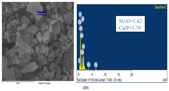 FE-SEM and EDX spectrometry were used to analyze the morphology and element distribution, respectively. The SEM image of HAP-ZE and EDX results are displayed in Figure 3 and Figure 4, respectively. As seen from Figure 3, compared with the raw BFS, the morphology of the prepared HAP-ZE has changed greatly. The HAP-ZE crystals generated at 80 °C implied nice development compared to those from BFS (see Figure 3B). It is speculated that the circular-shaped crystals and lumpy crystals are attributable to HAP and zeolite, respectively, based on the crystallographic features [38,39]. For the HAP-ZE crystals produced at 90 °C, HAP-ZE crystals also had asymmetrical circular shapes and lumpy crystals, which is smaller than the shape of the samples generated at 80 °C. At 100 °C, HAP-ZE crystals with a diameter of about 500 nm form an open frame structure with coral surface morphology (see Figure 3D). As the reaction temperature increased to 120 °C, it was found that the size and crystallinity of the HAP-ZE both increased. The observed morphological feature stays consistent with that for HAP-ZE previously reported [38,39], again proving the successful formation of HAP-ZE. Moreover, via the morphology displayed in the Figure 3, the lumpy crystal zeolite can be found to be most in the HAP-ZE obtained at 100 °C, which is consistent with zeolite content in Table 2. In addition, a certain degree of crystal agglomeration can be seen in HAP-ZE obtained at 120 °C (Figure 3E). This phenomenon could be attributed to the fact that the higher reaction temperature led to a higher surface energy of HAP-ZE crystals, and then led to the agglomeration of HAP-ZE crystals. The agglomeration of HAP-ZE crystals can significantly reduce both SSA and adsorption capacity. This is why the SSA of obtained HAP-ZE decreases when the reaction temperature increases over 100 °C. Therefore, HAP-ZE obtained at 100 °C with an open frame structure signifies that it has a large surface area and pore volume for adsorbates to access. Moreover, most zeolite crystals are evenly dispersed on the HAP crystals. Generally, before the EDX test, we use aluminum and copper standard sample for calibration. Meanwhile, the Ca/P molar ratios measured by EDX spectrometry were 1.96, 1.85, 1.69 and 1.79 at 80 °C, 90 °C, 100 °C and 120 °C, respectively. The Si/Al molar ratios measured by EDX spectrometry were 1.70, 1.65, 1.41 and 1.42 at 80 °C, 90 °C, 100 °C and 120 °C, respectively. The Ca/P and Si/Al molar ratios measured by EDX spectrometry were consistent with the XRF spectra analysis results (see Table 3). This phenomenon may be due to the uniform dispersion during the growth process of HAP-ZE.