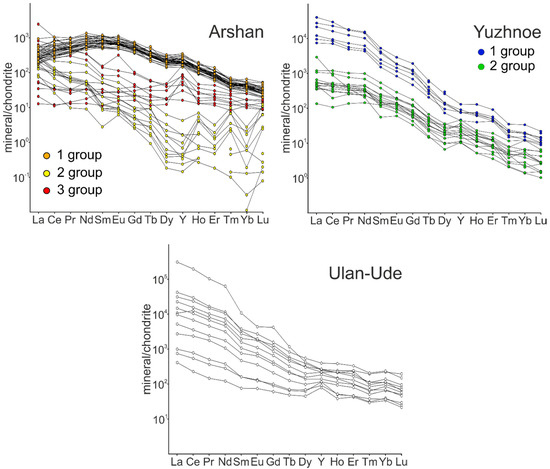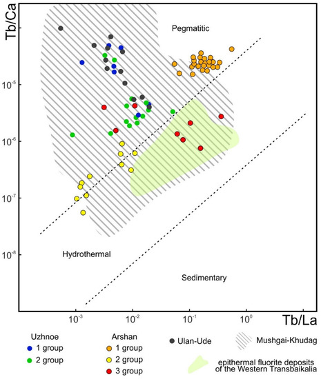 The Möller Tb/Ca vs. Tb/La diagram [35] has been used to classify fluorites by mineral-forming processes, based on the features of REE. Our data for the Ulan-Ude, Yuzhnoe, and the first and second groups of the Arshan occurrence fall within the range of pegmatitic fluorite area (Figure 5). The fluorites of the Arshan third group lie below the pegmatitc/hydrothermal boundary in the area of hydrothermal fluorite, which confirms our intrepretation of them as the latest in formation. The Arshan occurrence is characterized by long-term multistage formation of fluorite mineralization. A similar situation was revealed in the Mushugai-Khudag complex, which contains several generations of fluorite from orthomagmatic to hydrothermal [7].