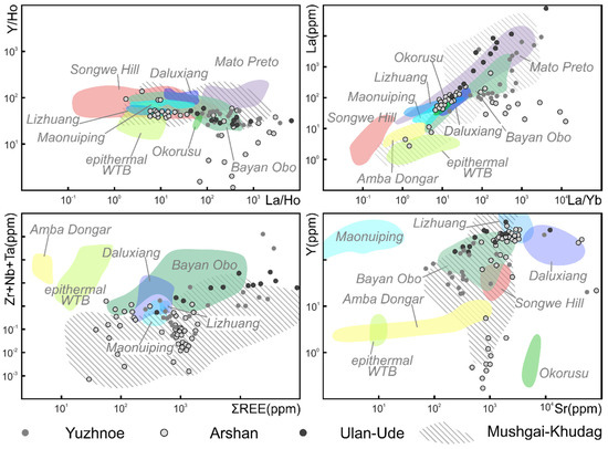 Plots of the Western Transbaikalia fluorites vs fluorites from REE deposits. (Amba Dongar [1]; Daluxiang, Lizhuang, Maonuiping, Bayan Obo [4,5,6]; Mato Preto [1]; Songwe Hill [3]; Okorusu [36]; epithermal WTB (epithermal fluorite deposits of the Western Transbaikalia) [10]; Mushgai-Khudag [7].
