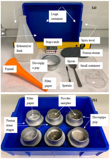 The tools and setup for the initial water uptake test described herein are depicted in Figure 1a,b and a detailed schematic with captions of the IWU test setup can be seen in Figure 2. The basis of this proposed test is the Enslin–Neff test traditionally used in geotechnical engineering, particularly in Germany [53,54,55]. However, the IWU test differs from the Enslin–Neff test by being wholly gravimetric and using a simpler experimental setup. The setup consisted of a triple-layered porous stone stage (Dporous stone = 100 mm, Wporous stone = 10 mm) partly immersed in water, a filter paper (Advantec 4A hardened filter paper, Dfilter paper = 90 mm) on top of the upper, dry porous stone and a powder sample spread evenly onto the central part of the filter paper surface. The properties of the filter paper included high wet strength, high pH resistance, slow flow and retention of fine particles (<5 μm). A circular hollow metal ring (Figure 1) Dsample ≈ 75 mm was used to assist the distribution of the powdered sample on the filter paper (i.e., sample was not allowed within a 7.5 mm “buffer zone” from the edge of the filter paper). The samples were not compacted in any way, just spread with the help of a spatula in a circle with an even thickness (Figure 1); the intention was to mimic the conditions of an actual concrete mix where cement particles are not compacted and have a direct interaction with water. The porous stones served to establish and maintain a uniform water supply.