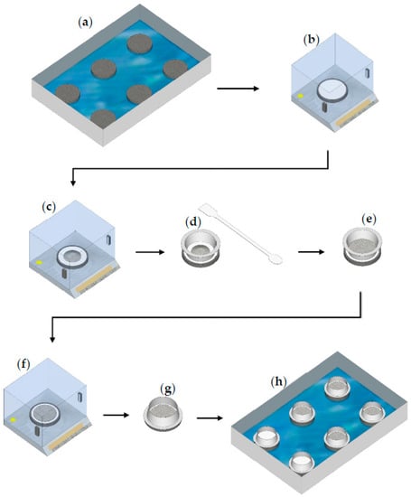 Steps of the initial water uptake test: (a) place two porous stones on top of each other in a large plastic container with water (water level = height of one porous stone); (b) tare the mass of the third (dry) porous stone + filter paper; (c) measure out ~5 g of sample; (d,e) with the help of a spatula and a downpipe pop, create a thin layer of sample with a 75 mm diameter; (f) re-weigh the sample and record the value; (g) place the downpipe pop around the flattened sample with the rimmed side down (D = 85 mm); and (h) start the IWU test by placing the third porous stone with the sample on top of the porous stone stack (containing two porous stones) in the large container with water (run the test for 1 min).