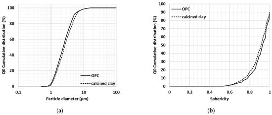 Particle size (a) and sphericity (b) of calcined clay and cement particles (re-plotted from Fehervari et al., 2019 [40]).
