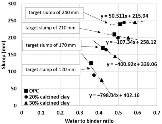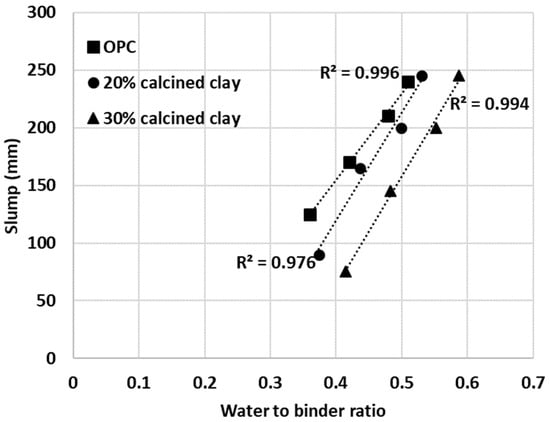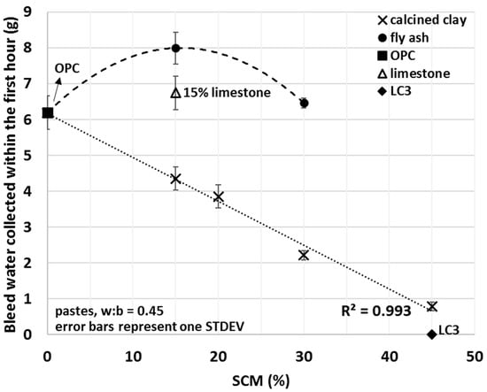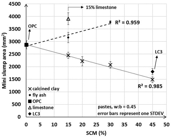 In a similar fashion, the measured mini bleed and mini slump values of limestone, fly ash and LC3 blends can be explained, although some other factors discussed below may also have impacted or even dominated the measured fresh properties. Fly ash addition, for example, exhibited a less pronounced effect on IWU compared to that of calcined clay (i.e., while negative, the absolute value of the slope of the linear regression for fly ash in Figure 8 is smaller than that of the calcined clay), and the linearity seemed to be valid for very low SCM percentages as well (note 0%, 15% and 30% fly ash additions were actually measured and 0.999 R2 value was found). The mini slump values for fly ash blends were larger than those of OPC which can be explained by a lower affinity of fly ash to water. Given that fly ash addition resulted in IWU ratios lower than 1, OPC has a greater affinity to water and if some of the OPC is replaced with fly ash then less water is taken up by the blend. Thus, in a fly ash–OPC blend, more water remains between the grains and particles as free water compared to that of an OPC–only system and this explains the measured greater mini slump values of fly ash blends compared to that of OPC.
