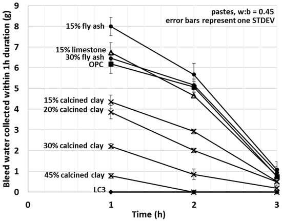 Bleed values upon the addition of calcined clay decreased with the amount used, showing a strong linear correlation (R2 = 0.993) between the amount of bleed water and the percentage of calcined clay. A 15% fly ash addition increased the amount of bleed water collected by 29%; however, replacement of 30% OPC with fly ash showed comparable bleed to that of OPC alone. Limestone slightly increased and the combination of limestone and calcined clay (LC3) decreased the bleeding of the tested cement pastes. For LC3 mixes, no bleed water was detected within the first 3 h of bleeding. These results indicate enhanced interactions between water and calcined clay containing blends and weaker interaction for other types of SCMs studied. Trends observed herein will be explained in light of the initial water uptake in the next Section 3.4.