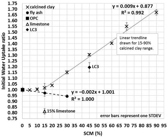 The IWU ratio of calcined clay–OPC blends was measured on an extended range of OPC replacement with up to 90% SCM content (Figure 8). Results indicated that calcined clay–OPC blends with greater calcined clay content took up more water. However, 60–90% OPC replacement with calcined clay is generally considered to be a non-viable option in most cases, and the intention was to study the effect of calcined clay on the initial water uptake of SCM blends to gain a deeper understanding of how the proposed IWU method performs under extreme conditions (e.g., when SCMs constitute the major component of the blend). Based on seven different calcined clay percentages (15–90%), a strongly linear correlation (R2 = 0.992) was found between the IWU ratio and the amount of clay blended together with OPC (Figure 8); however, the same linearity did not seem to exist at lower calcined clay percentages (0–10% calcined clay). In other words, the proposed IWU test cannot properly differentiate the IWU ratios for ≤10% calcined clay SCM.