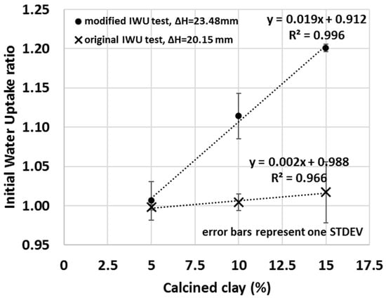 The sensitivity of the test can be increased by increasing the capillarity height differential (distance between the top of the water to the bottom of the sample), for example, by using less water (or using a thicker porous stone). This increased capillarity differential will enhance the relative impact of the sample itself on the measured water uptake ratio because the larger distance for water to migrate diminishes the capillary force at the bottom of the sample, and thus samples with lower matric suction will take up less water. Samples with higher affinity for water will exert greater suction and draw water to greater capillary height differential. In Figure 9 (• symbols), for instance, the height difference between the water surface and sample was increased from 20.15 ± 0.05 mm to 23.48 ± 0.05 mm by using less water (V = 656 g ± 0.3% instead of 985 g ± 0.3%), and consequently, greater IWU ratios of the calcined clay blends were measure compared to that of the original IWU test (X symbols in Figure 9). Thus, although the total amount of water that migrated into the samples was less with a greater capillary height differential, the water uptake by a sample with greater matric suction was enhanced relative to one with lower matric suction. More importantly, by increasing the capillary height differential by only a few mm, a strongly linear correlation between the amount of calcined clay used in the blend and the measured IWU ratio was observed, having a greater slope (i.e., greater sensitivity) compared to that of the original method. Modifications similar to this can be easily achieved and demonstrate the ability of the IWU test to be custom-made for various types and amounts of SCMs. While the original IWU test (with the height difference of 20.15 ± 0.05 mm) provided a strong linear relationship between the IWU ratio and percentage of SCM used at or above 15% of calcined clay replacement, this could be used to optimize lower replacement levels. This information is highly useful in explaining the measured slump or bleed of the various calcined-clay blends or to evaluate the possible pathways of hydration reactions that take place as the material cures.