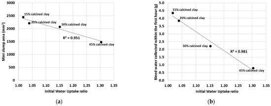 Linear regression between the mini slump values (a) or mini bleed values (b) and the IWU ratios of calcined clay blends. (Note that the linear relationship is obtained at calcined clay percentages between 15% and 45%.).