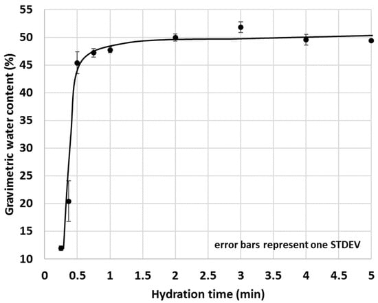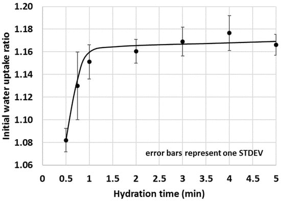 The aim of the proposed experimental setup was to quantify the initial affinity of various cementitious materials to water; thus, the 1 min duration was selected because we desired to focus on the initial interactions between water and various cementitious materials. However, shorter and longer durations and different sample sizes were also trialled—the results of which are reported in the “Results and Discussion”. In our experience, a 5 g powdered sample with 1 min hydration time was found to be the most appropriate test setup for quantifying meaningful differences in the IWU of cementitious materials.