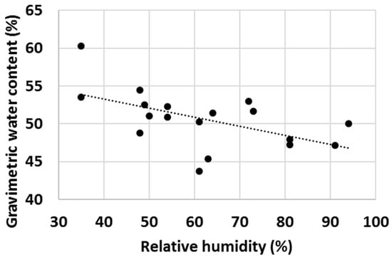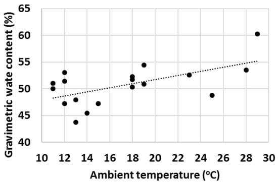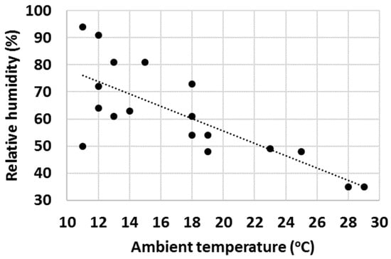 Finally, with a high number of tests, it was observed that ambient properties such as temperature and relative humidity (RH) had an impact on the water uptake behaviour of various cementitious materials. Firstly, the effect of ambient temperature on the gravimetric water content of OPC after 1 min test time was evaluated (Figure 16) and an increasing trend of GWC with temperature was observed. RH impacted the measured GWC of OPC; and on the contrary, a decreasing trend of GWC with growing RH was observed (Figure 17). It was hypothesized that the two investigated parameters were not independent from each other, and to check this, the ambient temperature was plotted against RH. As anticipated, in general, the RH decreased with ambient temperature (Figure 18).