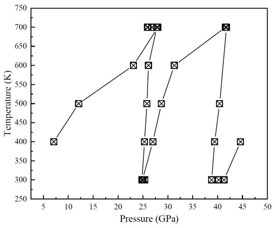 In situ HPHT single-crystal XRD experiments were carried out at beamline 13-BMC with the wavelength of 0.43409 Å at Advanced Photon Source (APS), Argonne National Laboratory (ANL) [32]. A BX90-type diamond anvil cell with a resistive micro-heater [33] was employed to achieve high pressure and high temperature conditions. A rhenium (Re) foil with an initial thickness of 260 µm was used as the gasket. The gasket was pre-indented to a thickness of about 30 µm, and a hole of 120 µm in diameter was drilled at the center to serve as sample chamber. Single crystal vanadinite sample, ruby spheres, and gold were loaded into the sample chamber. Neon was loaded using the COMPRES/GSECARS gas-loading system [34] and serves as the pressure transmitting medium [35]. Gold was used as the primary pressure scale [36], with which pressures were determined before and after each XRD measurement. In order to find evidence of phase transition in vanadinite, several rounds of temperature/pressure changing were carried out. The corresponding PT path of HPHT experiments were illustrated in Figure 1. Each condition was lasted about 30 min. At first temperature was increased from 300 K to 700 K at constant 40 PSI condition. Then, pressure was increased from 50 PSI to 110 PSI at the same temperature 700 K. Subsequently, temperature was decreased from 700 K to 300 K at constant 110 PSI condition. After that the cell was compressed from 110 PSI to 190 PSI at 300 K. These steps were repeated in turn and the experiments was ended at 44.6 GPa and 400 K because of an abrupt gas leaking. The XRD experiments were only performed during compression controlled by a membrane system in 13-BMC, and no XRD data were collected during decompression. DIOPTAS software was used to integrate the XRD patterns [37].