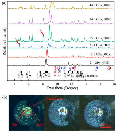Under the optical microscope, an obvious change from transparent to opaque was observed at around 26.2 GPa and 600 K, and the sample remained opaque to the highest pressures. This was verified by a drastic color change from reddish (reddish for naked eye but orange in the photo taken by Leica microscope with Sony camera due to the white-balance setting) to transparent during decompression after the experiments (Figure 3b), indicative a reversible phase transition at ~26.2 GPa. Similar phenomena were observed in many compounds upon compression, i.e., KTb(MoO4)2 [45], siderite [46], and manganotantalite [47]. Jayaraman et al. [45] attributed the color change of KTb(MoO4)2 to 4f-5d transition in Tb initiated by the structural transition, and consequent intervalence charge transfer between Tb and Mo. Müeller et al. [46] associated the transparent-green color change of siderite to the spin transition. Liu et al. [47] explained the phenomenon by the alteration of electronic structure properties and a narrowing of band gap in Mn(Ta,Nb)2O6. It is anticipated that the transparent-reddish color change of vanadinite observed in this study likely results from the energy level splitting of transition element V. Future experiments and theoretical calculations are necessary to fully understand the character of reversible pressure-induced color changes in vanadinite.