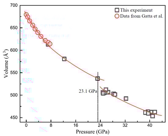 Compression curve of vanadinite with data from reference [13] and this experiment. The red lines are guides for eyes to show the discontinuous volume reduction around 23 GPa.