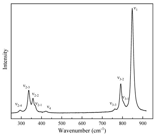 The Raman spectrum of our vanadinite sample was collected at ambient conditions (Figure 5). A total of nine bands are observed, which is less than the predicted internal and external modes in some apatite-structured phosphate [18,50,51,52], but agrees with other vanadinite specimens [39,50]. The strongest single band observed at 848 cm−1 is assigned to the ν1 symmetric stretching mode [50] and three bands at 802, 791 and 760 cm−1 are attributed to ν3 antisymmetric stretching modes, respectively. The relatively broad 420 cm−1 band is attributed to the ν4 OVO bending vibration [50]. The other four overlapping ν2 symmetric bending modes are located narrowly at 367, 357, 336 and 295 cm−1, which are caused by the lowering of the VO43− symmetry within the vanadinite structure [50]. The Raman active modes of vanadinite are in good agreement with previous studies, in which it was found that the ν1 symmetric stretching band in mimetite-arsenian pyromorphite [39] and pyromorphite-vanadinite solid solutions [50] shifts toward lower wavenumber with the increase of the atomic mass in [BO4] tetrahedra (B = P, V, As). This can be anticipated, because the frequency of a Raman band is dependent on lattice vibrations, the masses of the atoms/ions, and the strength between the atoms/ions [17,53].