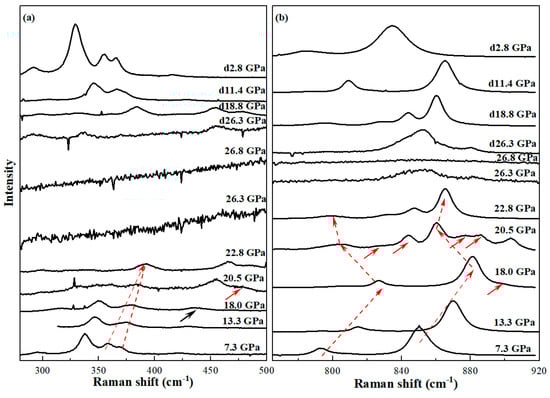 Representative Raman spectra of vanadinite at different high pressures. (a) Raman shifts between 250 and 500 cm−1. (b) Raman shifts between 700 and 900 cm−1. The highest pressure is 26.8 GPa and the data between d26.3 GPa and d2.8 GPa were collected during decompression. Dash lines with arrows serve as guide for eyes showing the direction of variation in these maxima. The red and black arrows point to the new bands and the high ν4 bands of vanadinite at 300 K in a diamond anvil cell, respectively.
