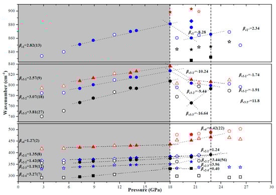 The detailed wavenumbers of the Raman bands varying with pressure below 18.0 GPa are listed in Table 1 and displayed in Figure 7. It is apparent that the modes with the same origin exhibit similar dependences; for example, the bands arisen from the symmetric and antisymmetric stretching vibration of the V–O bond blue-shift at slopes of 2.57–3.81 cm−1·GPa−1, which is more than twice times the rate of the others (1.19–1.27 cm−1·GPa−1) for OVO bonding vibrations except the ν2-4. The largest pressure dependence value of ν2-4 may be due to the limited data and the difficulty to locate peak positions precisely above 8.9 GPa. The high frequency modes exhibit a steeper pressure dependence for wavenumber as pressure increases. Figure 6 and Figure 7 indicate that vanadinite may undergo phase transitions between 18.0 and 22.8 GPa.