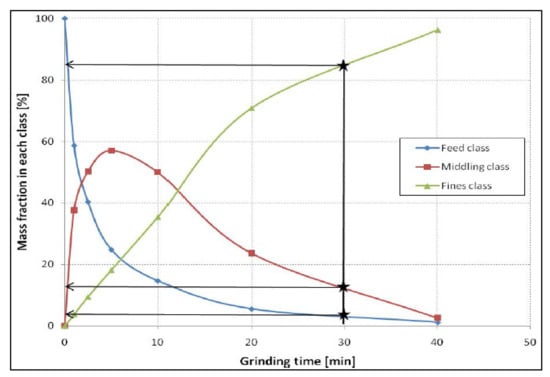 Grinding kinetics as plotted for the three size classes Feed class (m1), Middling class (m2) and Fines class (m3) [].
