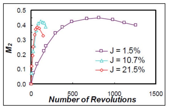 We can then extend this analysis to compare the discrete maxima of m2 obtained under different specified operating conditions. An example of different maxima of m2 obtained with dissimilar media charges (J) at a single speed is illustrated in Figure 3.
