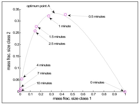 Now that mass fractions at different grinding times have been clearly explained, the next step is to present the data in a final AR format. Figure 4 shows how particle size distributions (PSD) can be connected with grinding time. In this plot, the boundary curve describes the processes used and can be interpreted in terms of pieces of equipment (implicitly identifying the equipment required for best performance). Mass fractions external to the AR defined by its trajectory cannot be achieved. The turning point of the curve isolates an optimum solution when the objective is to maximize the mass in size class 2 (m2). This solves the optimization problem and provides the process control policy needed to achieve that objective.