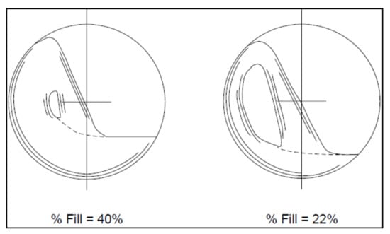 However, Fortsch et al. [] reported a slightly lower media filling. The authors used the under-loading multiplier concept which is pronounced by the hole or gap in the middle of the charge as the mill is turning. They then reported that operating a ball mill at 75% critical speed and a 22% charge level creates a higher cataracting region than at 75% critical speed and 40% charge level. The multiplier concept is shown in Figure 6.