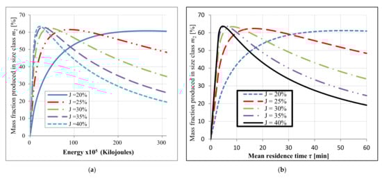 These results contrasted those of Austin et al. [] and Ozkan et al. [] which suggested that energy is most efficiently used at = 0.75 and J = 40% but in large-scale ball milling. This is on account of a widely held belief that as the mill draws maximum power, the rate of breakage also gets to the maximum. Motivated by that disparity, Metzger et al. [] performed experiments with the parameters of ball filling (J = 31.5%) and mill speed ( = 0.71) but the process was not optimised as expected; rather, a lower amount of the desired size was produced.