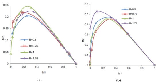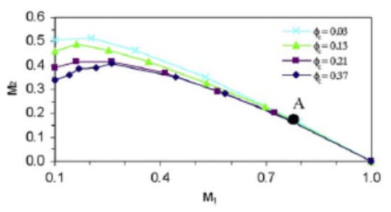 (a) m2 vs. m1 (b) m3 vs. m1 for different concentrations of solids [].