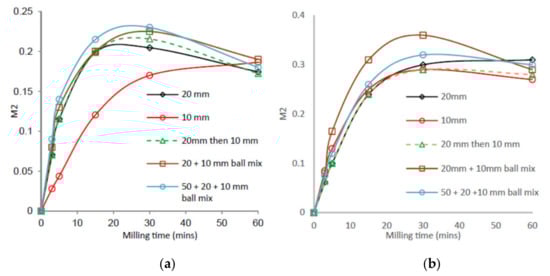 Mass fraction m2 vs. milling time for various ball sizes (a) feed size = −1700 + 850 µm (b) feed size −1180 + 850 µm [].