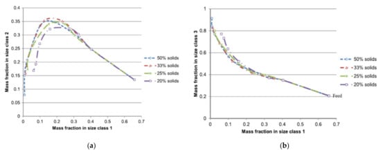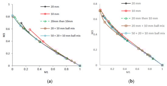 Mass fraction m3 vs. m1 for various ball sizes (a) feed size = −1700 + 850 µm (b) feed size −1180 + 850 µm [].