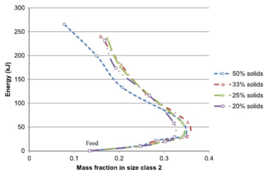 Even when assessed in terms of energy, the 33% solid concentration led to the most efficient use of energy to produce m2 as depicted in Figure 13 whereas, for m3, it was the 50% solid concentration. This demonstrates that energy expenditure is the function of slurry density which in turn is dictated by the objective function.