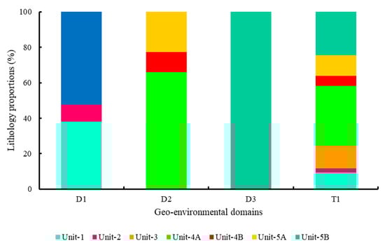 Figure 1. Blend samples prepared to assess geochemical interactions among lithological units within geo-environmental domains (the size of the boxes represent blending proportions). D1. the mafic domain, D2. the dacite domain, D3. the intermediate domain, T1. the all-embracing domain, Unit-1. andesitic basalt unit, Unit-2. Fe-Ti rich basalt, Unit-3. andesite, Unit-4A. dacite, dacitic tuff, dacitic intrusions, and quartz-feldspar porphyry type 1, Unit-4B. alkaline andesite and alkaline andesitic tuff, Unit-5A. dacite, dacitic tuff, dacitic intrusions, and quartz-feldspar porphyry type 2, Unit-5B. alkaline andesite and alkaline andesitic tuffs.