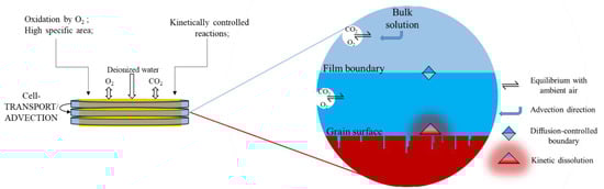Weathering cell tests provide a highly oxidizing environment where atmospheric oxygen and water are not transport-limited throughout the test duration. Therefore, the effluent quality stems mainly from the inherent mineral reactivity and the available reactive surfaces. Oxidation and dissolution reactions under such conditions are kinetically controlled. The conceptual model relies on oxidation and dissolution rates of the sulphides and the gangue minerals, respectively. In accordance with the mineralogical characterization results, a kinetic reactivity rate for each mineral was selected from the literature based upon experimental conditions. The kinetics should be coupled with equilibrium and transport processes deemed relevant to the system. The incoming leach solution as well as the pore water of the system were considered to be in equilibrium with oxygen and carbon dioxide. These equilibrium reactions allowed no restriction in oxygen supply; thus, gas transport problems were precluded, which is in line with PHREEQC limitations [74]. This equilibrium component allowed the modeling of kinetically controlled reactions [87,88]. Transport processes were embedded along the 1D discretized length of the system. The advective transport was intended to simulate leach solution advection as a function of the residence time and volumetric flow. The residence time would relate kinetic reactions to advective transport in order to control the time span of the water–rock interactions. The diffusive transport herein considers diffusion of dissolved species from the particle surfaces to the pore water. In this regard, the conceptual model assumed that a thin water film surrounded the particle surfaces, that kinetic reactions occurred within the water film, and that the products that were subsequently released were transferred to the bulk solution through a diffusion boundary. An oxygen reservoir was implemented within the water film to trigger and maintain sulphide oxidation (Figure 2). This modeling approach assumed that weathering rate laws for monomineralic samples can be utilized for mixtures of minerals (pyrite, carbonates, and silicates) evenly distributed over the uniform sample size distribution obtained after grinding [79,80]. Opting for specific rates from literature aimed to (i) assess their reliability for a mixture of minerals and their relevance for the weathering cell test, and (ii) provide prompt scoping surveys during data-limited situations.